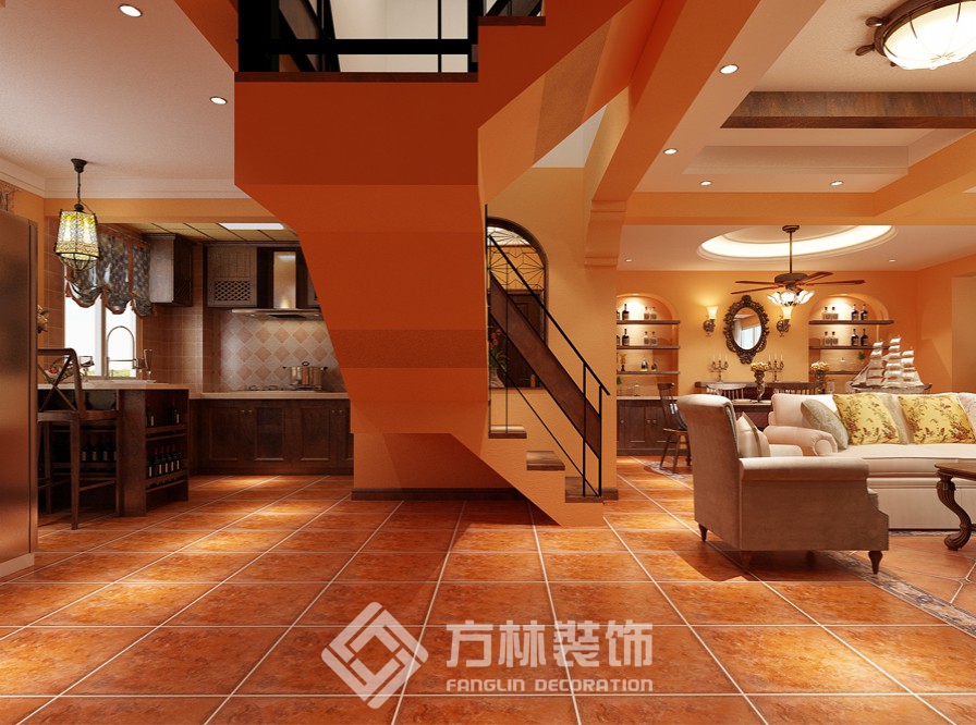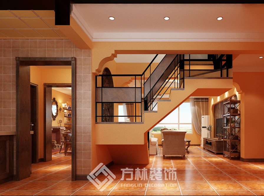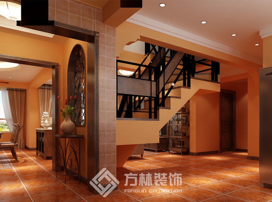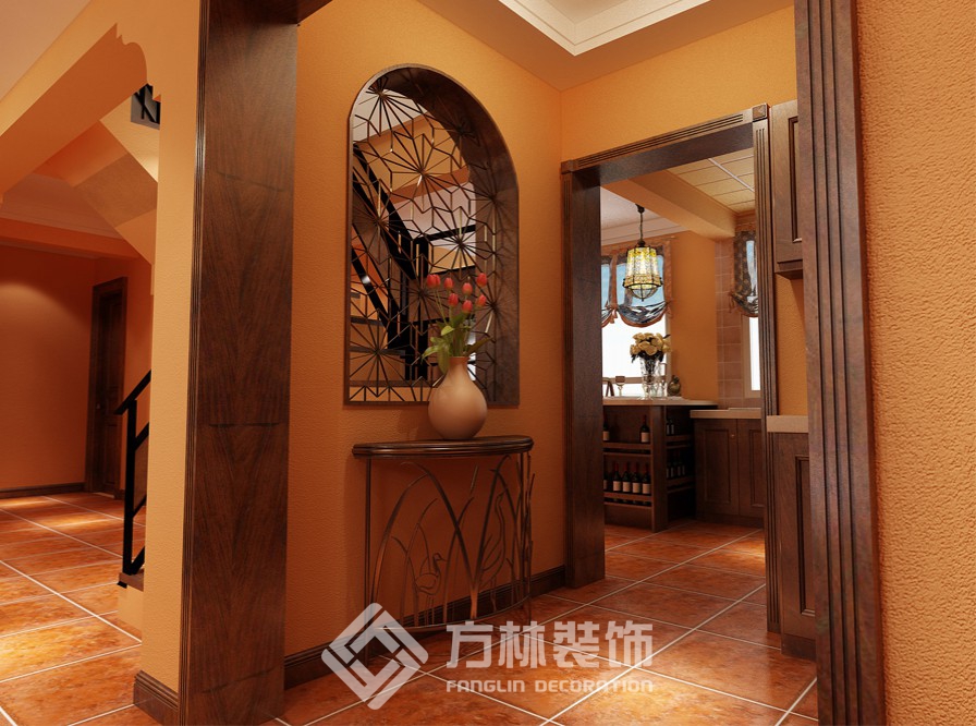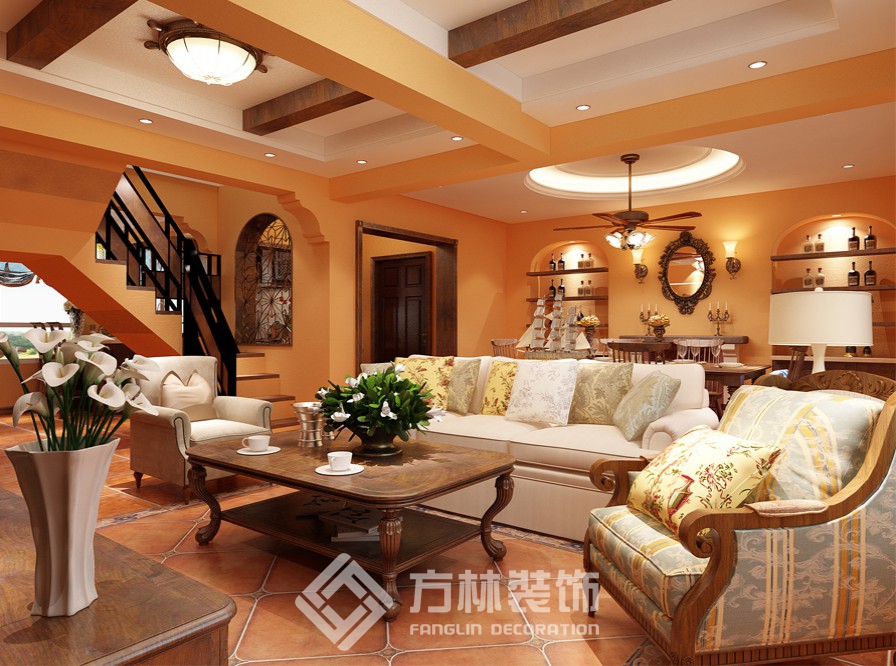 設(shè)計理念:整個空間以深咖色木質(zhì)材質(zhì)的家具為主,客廳墻上的裝飾鏡和配以棉麻的布藝更給人呈現(xiàn)出溫馨效果,使得整個空間既給人以厚重的感覺, 也給人比較溫馨、舒適的氛圍。 陳設(shè)主色調(diào): 以橙紅色、深咖色為底色,以米白色為點綴色。