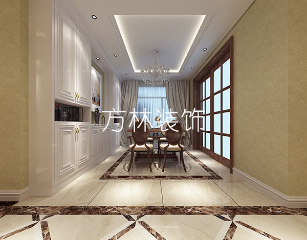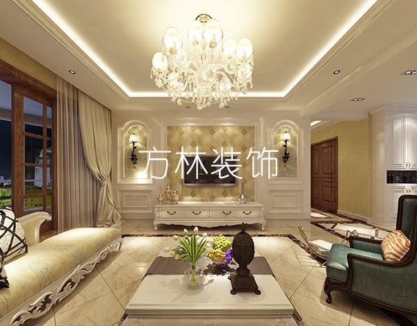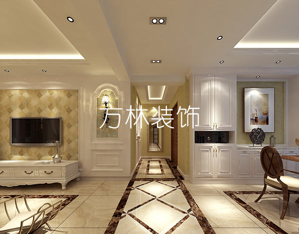 客戶為50歲成功人士,對家的要求崇尚歐式風(fēng)格,喜歡白色家具配飾。首先設(shè)計(jì)師對戶型進(jìn)行修改,把進(jìn)門墻體,過道等戶型進(jìn)行拆改并將陽臺擴(kuò)到客廳內(nèi)加大客廳進(jìn)深。戶型修改后將進(jìn)門鞋衣柜內(nèi)嵌,過道變大和門廳接近,方便地面地磚造型。戶型劃分取用用了兩種手法,地面與天花的劃分把進(jìn)門,客廳,過道,餐廳劃分明確并把成品酒柜定制到墻體后期酒柜直接與吊棚連接,即一體又美觀。電視墻隱蔽門的應(yīng)用將門隱藏,成為造型一部分美觀大方。