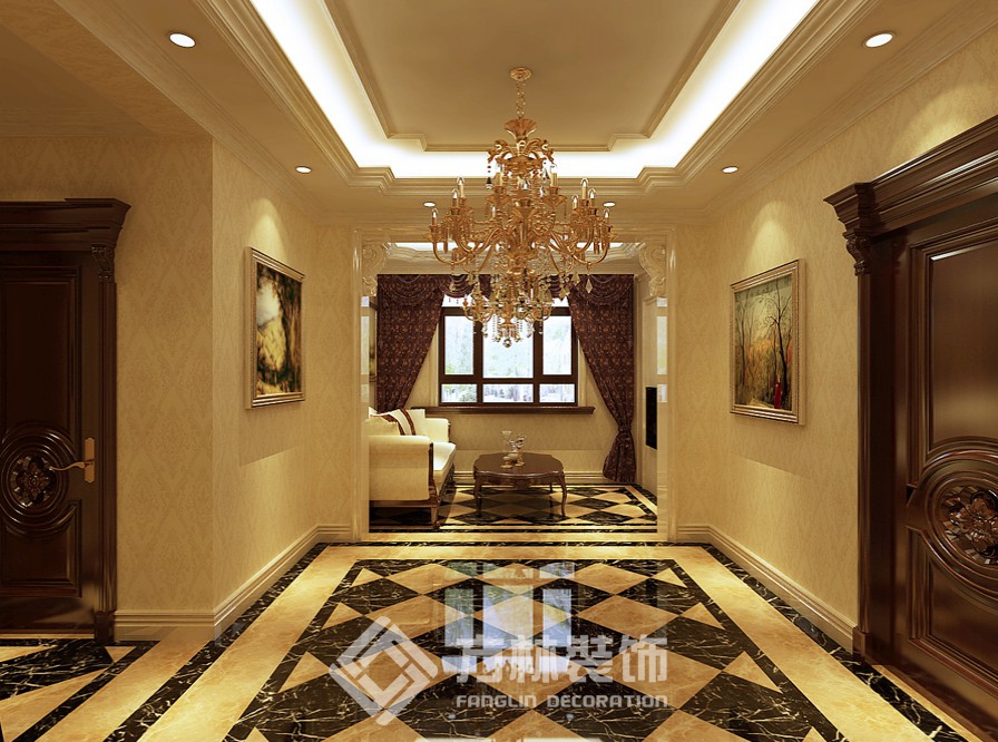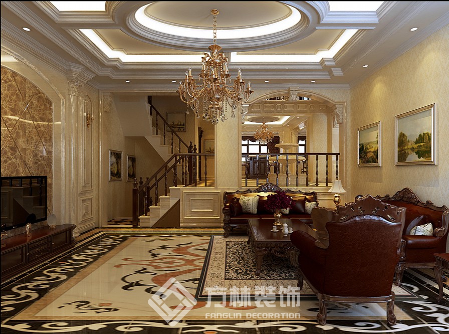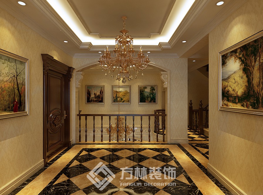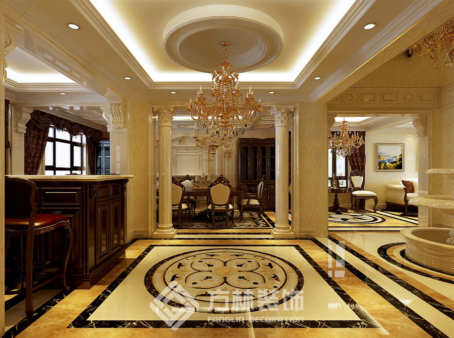 設(shè)計(jì)理念:本案例為歐式風(fēng)格,全大理石瓷磚鋪設(shè),過廊處的噴泉裝飾更加的有藝術(shù)感,暖色的色調(diào)使得整個(gè)房間有家的氛圍