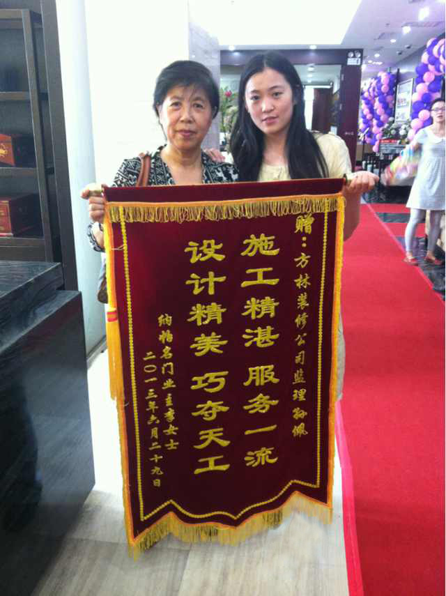 精工飾家,用心才能完美。李阿姨和小林子的合影!謝謝李阿姨給我們監(jiān)理送來錦旗,感謝李阿姨對方林的認(rèn)可!方林的所有員工都會再接再厲,更創(chuàng)輝煌!