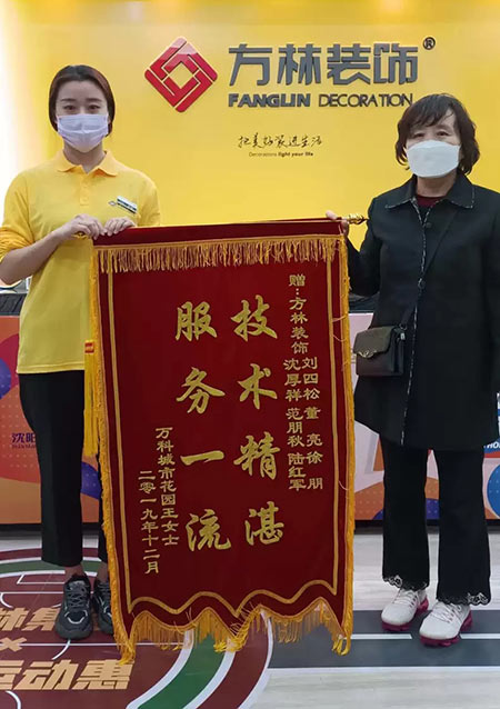 方林裝飾就是好 表揚(yáng)感謝少不了 大家一起來努力 創(chuàng)造輝煌好成績(jī) 萬科城市花園(園區(qū))業(yè)主親自到公司送來錦旗,感謝所有方林工作人員的工作認(rèn)真、負(fù)責(zé),工藝技能的精湛,他們?nèi)胰硕己軡M意 讓我們共同努力,用心服務(wù)好每一位客戶!