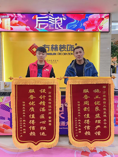 方林裝飾就是好 表揚感謝少不了 大家一起來努力 創(chuàng)造輝煌好成績 伯頓莊園業(yè)主親自到公司送來錦旗,感謝所有方林工作人員的工作認真、負責,工藝技能的精湛,他們?nèi)胰硕己軡M意 讓我們共同努力,用心服務好每一位客戶!